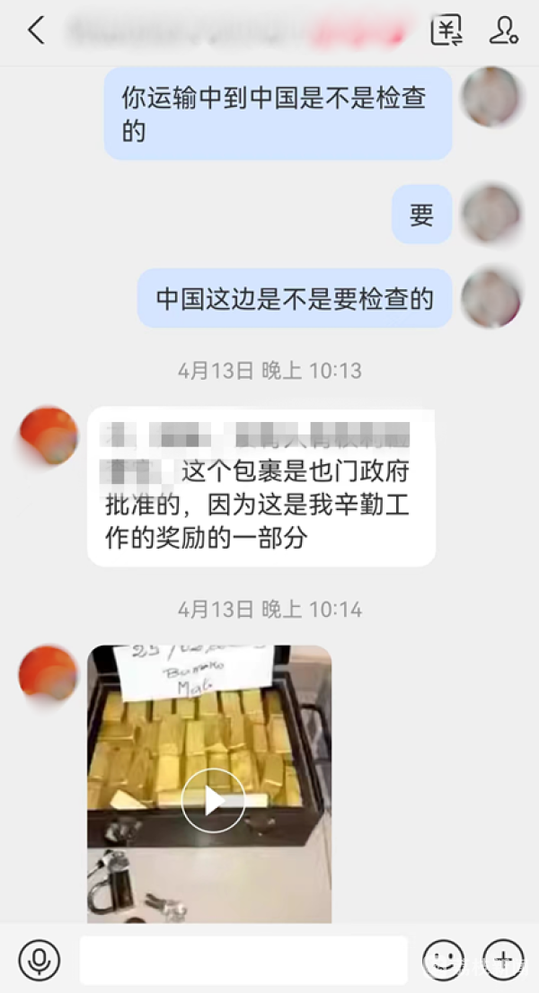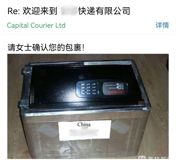 感受到“亨利”对自己的信任,周女士答应了对方的请求,此时“亨利”又提出,自己在战区无法使用银行卡转账,需要周女士帮忙先垫付邮费。为了打消周女士的顾虑,“亨利”还将装有黄金的箱子密码告诉了周女士,称等任务结束后,就来中国发展。信以为真的周女士便将家庭住址等信息发给了对方,很快便收到了航运公司发来的邮件。