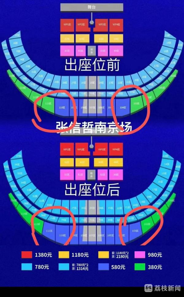 随着投诉人数不断增加,歌迷们突然发现,大麦网上的座位示意图悄然间发生了更改——原先处于绿色区域、售价380元的103和111区,已经变成了代表售价580元的蓝色,这一操作立刻引起了歌迷们的强烈不满。