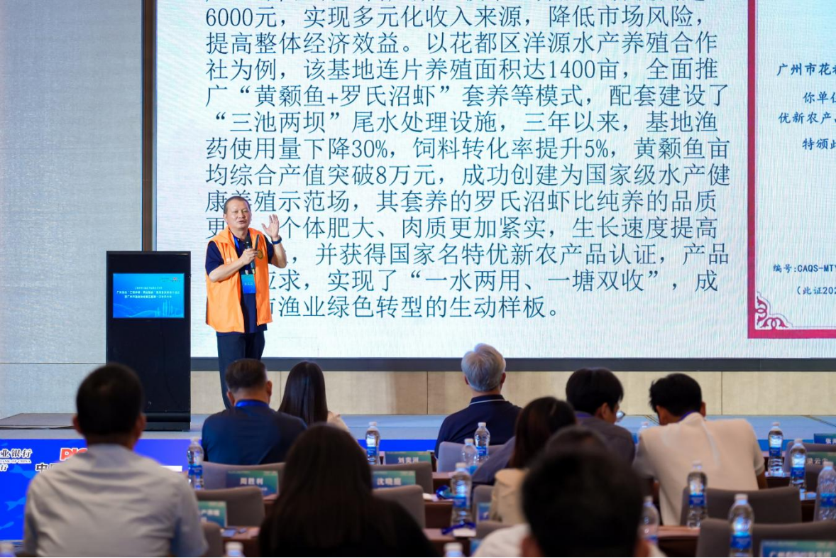 生态渔业板块集中呈现“工商并举”的广州实践。花都区农业技术管理中心正高级工程师李文卫讲解了“N鱼+罗氏沼虾”生态综合养殖模式。该模式实现“一水两用、一塘双收”,在不增加饲料成本条件下,每亩净增收罗氏沼虾200斤,综合效益提高超6000元,已获国家名特优新农产品认证,渔药用量下降30%,成为渔业绿色转型样板。现场展示的半斤以上生态大虾引发嘉宾广泛关注。